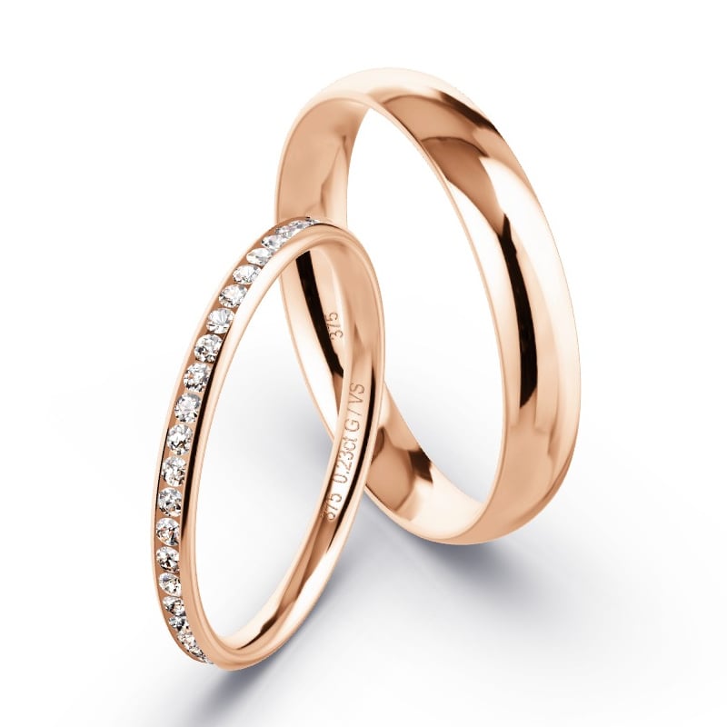 Matching wedding rings comprise a pair of bands that symbolise the union of partners through similar or identical design elements, such as style, metals, gemstones, or engravings. His and her wedding rings serve as a palpable emblem of unity that also respects the individuality of each partner. For instance, while both might feature the same metal, like platinum, variations in width or gem detailing may tailor to personal tastes.